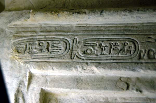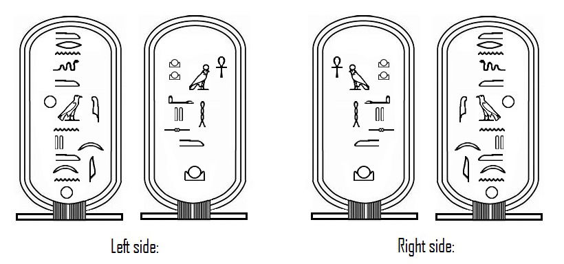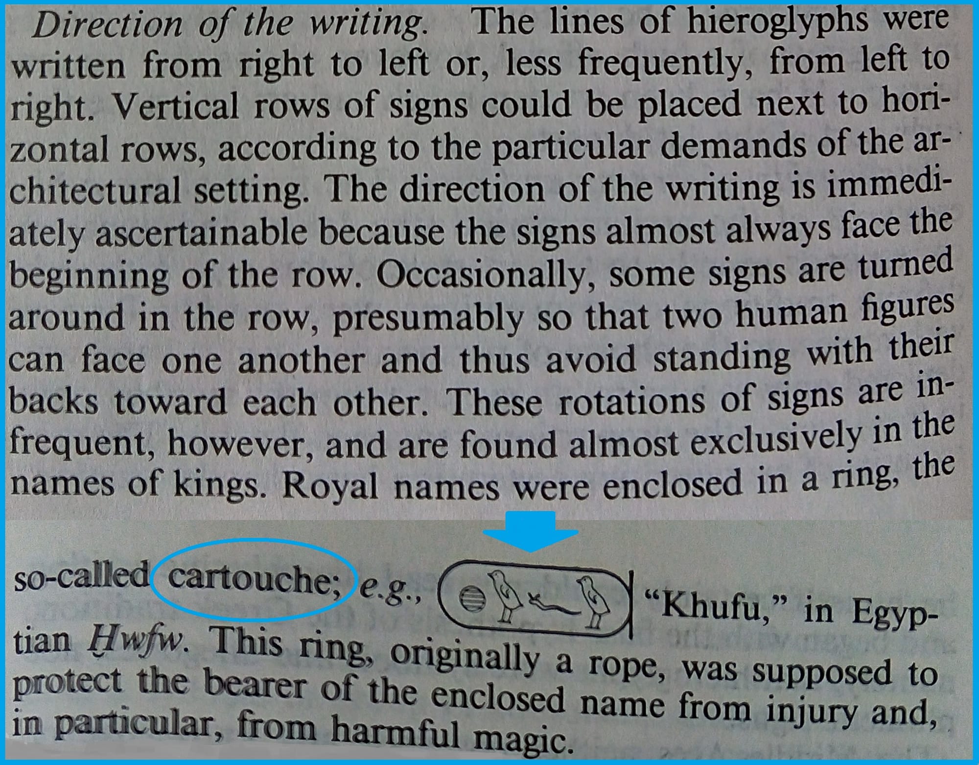 ‘Writing: Hieroglyphic Writing’ - ‘Direction of the writing - The lines of hieroglyphs were written from right to left or, less frequently, from left to right. Vertical rows of signs could be placed next to horizontal rows, according to the demands of the architectural setting. The direction of the writing is immediately ascertainable because the signs almost always face the beginning of the row. Occasionally, some signs are turned around in the row, presumably so that two human figures can face one another and thus avoid standing with their backs toward each other. These rotations of signs are infrequent, however, and are found almost exclusively in the names of Kings. Royal names were enclosed in a ring, the so-called ‘cartouche’. This ring, originally a rope, was supposed to protect the bearer of the enclosed name from injury and from harmful magic’ (The New Encyclopædia Britannica, 2005, 15th Edition, Vol. 29 - ‘Writing: Hieroglyphic Writing’ - p. 1039).