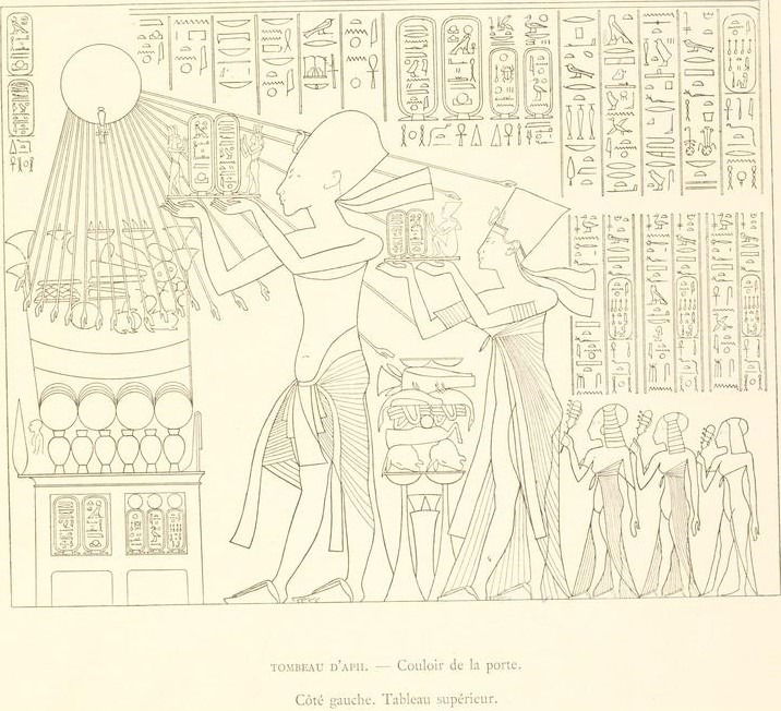 No. [2] An abstract illustration ‘picture-scape’ from the Great Temple of the Aten, Tell el-Amarna (Akhetaten) 18th Dynasty, Ancient Egypt; showing hieroglyphs related to Akhenaten, his ‘Great Royal Wife’ Nefertiti and their family (Nefertiti’s daughters) - Wikipedia.org - https://commons.wikimedia.org/wiki/Category:Nefertiti