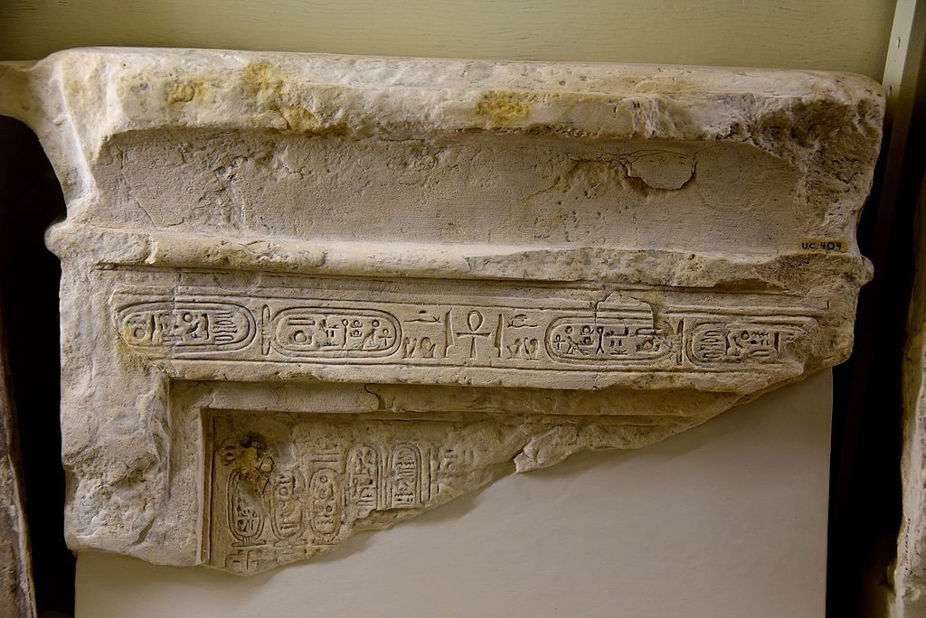 No. [8] An example of Nefertiti’s ‘Aten ‘cartouches’’ used on architectural sculpture (1): a fragment of a stela showing ‘cartouches’ of Akhenaten, Nefertiti, and Aten, Tell el-Amarna (Akhetaten) 18th Dynasty, Ancient Egypt, Petrie Museum of Egyptian Archaeology, London - Wikipedia.org - https://en.wikipedia.org/wiki/Cartouche