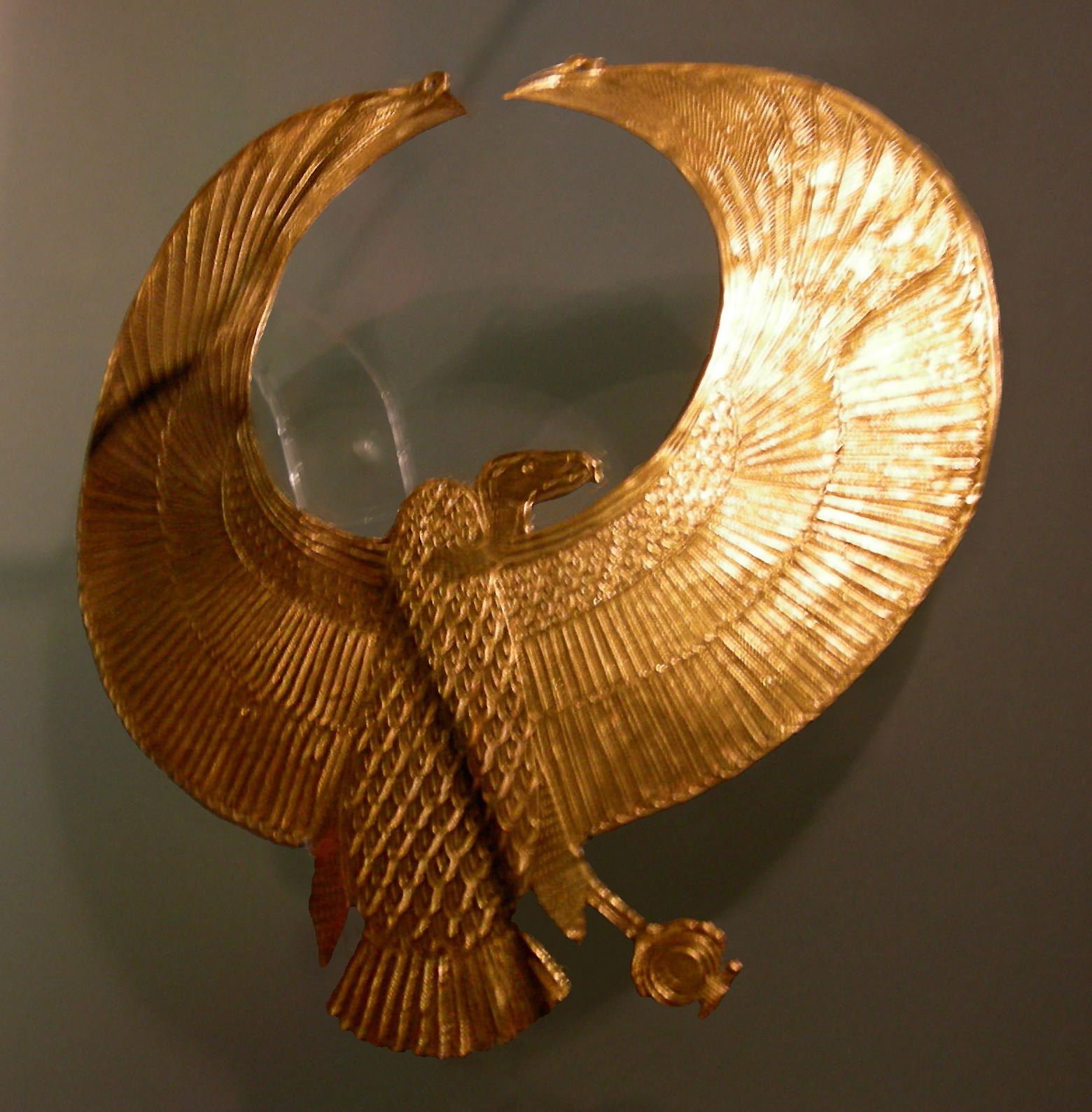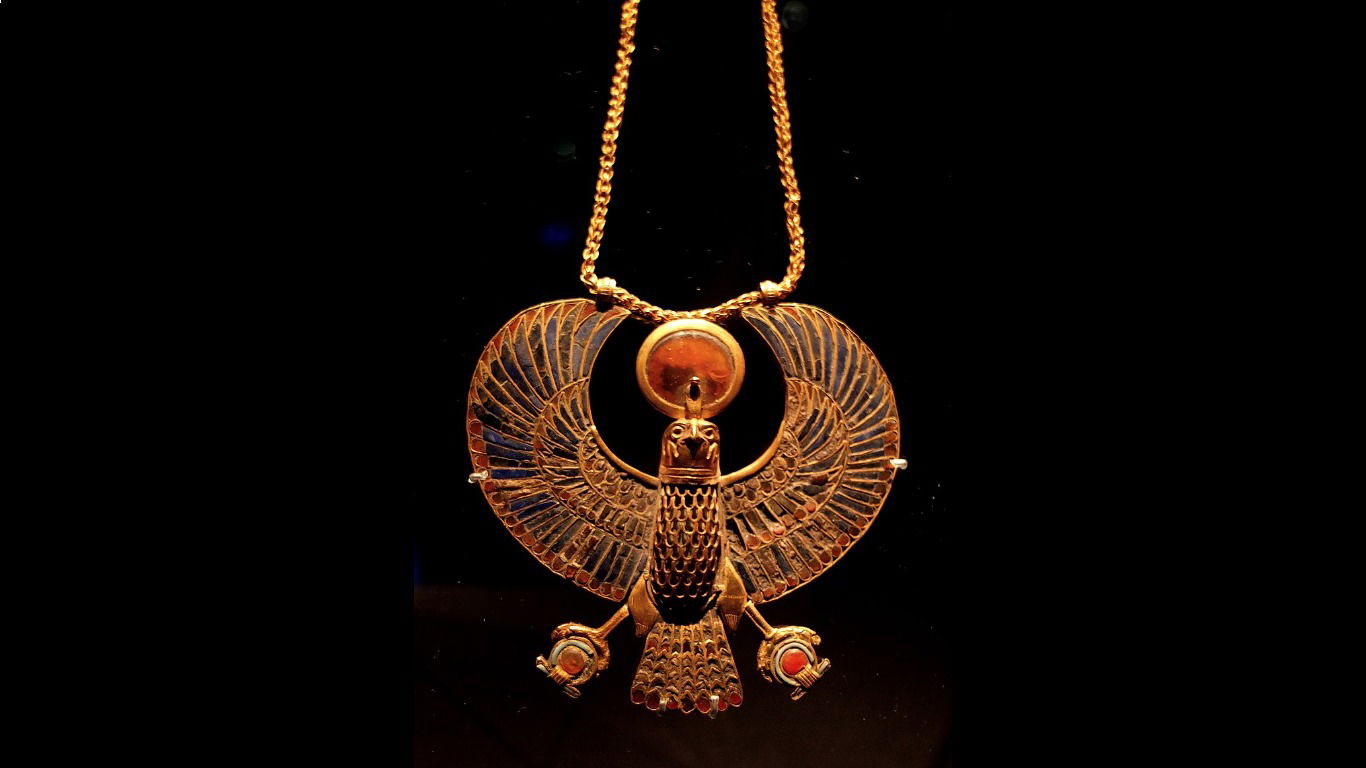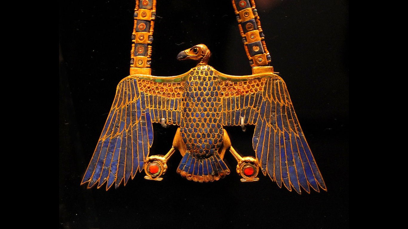No. [14] The vulture goddess (Nekhbet) carrying in both talons a ‘Shen ring’ - jewellery ‘discovered on the mummy’ of ‘Tomb KV 62’ (1922) Tutankhamen’s tomb - Wikipedia.org - https://commons.wikimedia.org/wiki/Category:Treasure_of_Tutankhamun