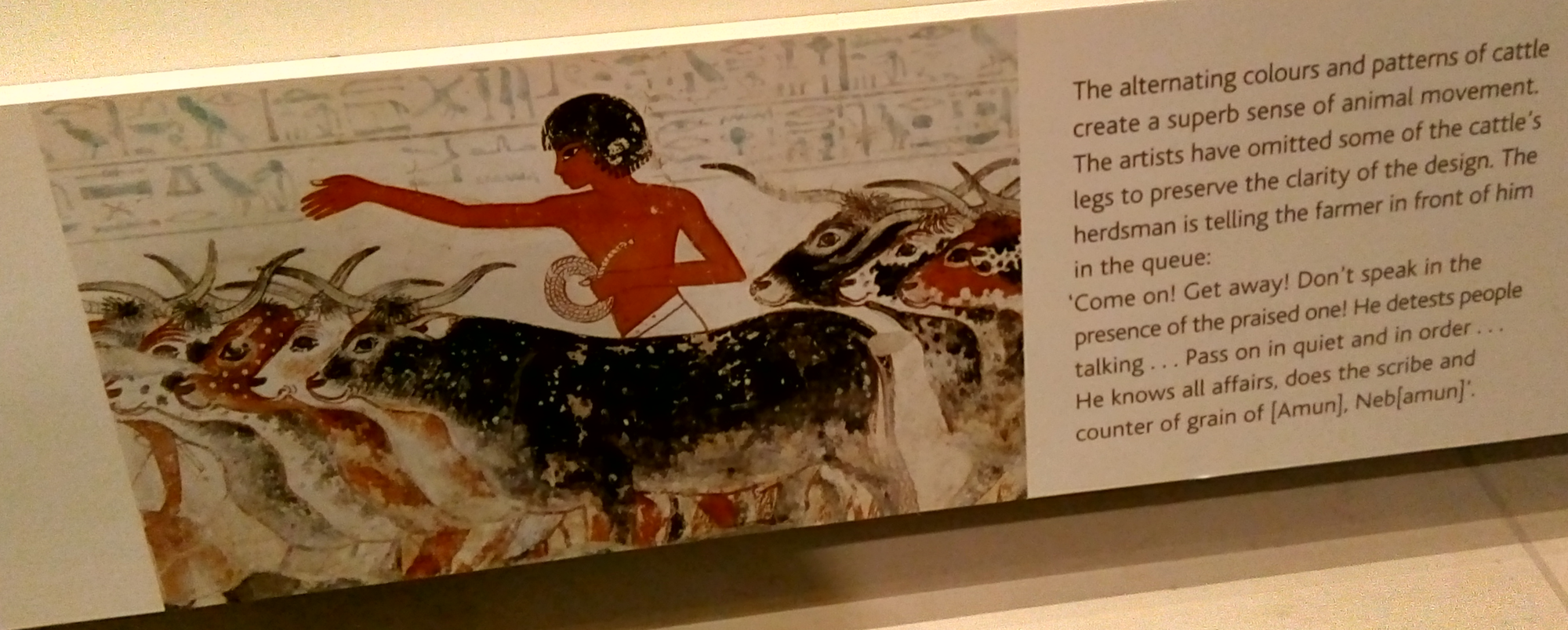 [8] Reference sign - for the wall painting (the lower section) of 'Nebamun with his cattle' - Room 61, The British Museum, London - See, also, URL links: a). Flickr.com - https://www.flickr.com/photos/141521575@N02/ | b). Pinterest.co.uk - https://www.pinterest.co.uk/richardfuster1641/christmas-2018/